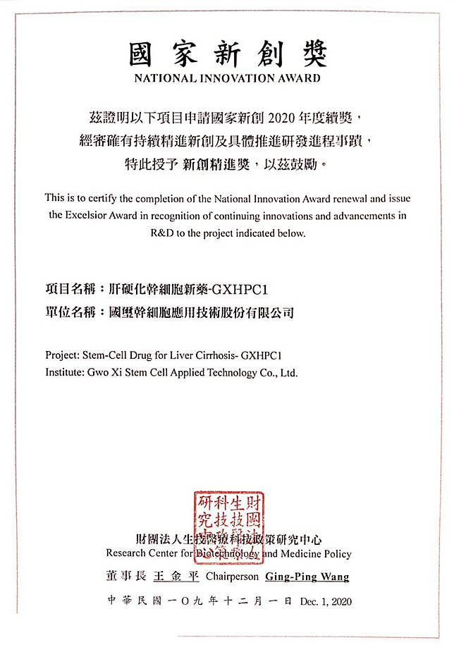 由生策會舉辦的「國家新創精進獎」,旨在表彰獲獎單位能持續精進創新、邁向卓越。國璽集團 (證劵代號:6704) 於 12/1 獲頒此獎,表揚其肝硬化幹細胞新藥「清肝淨 (GXHPC1)」具備持續精進的斐然成就。